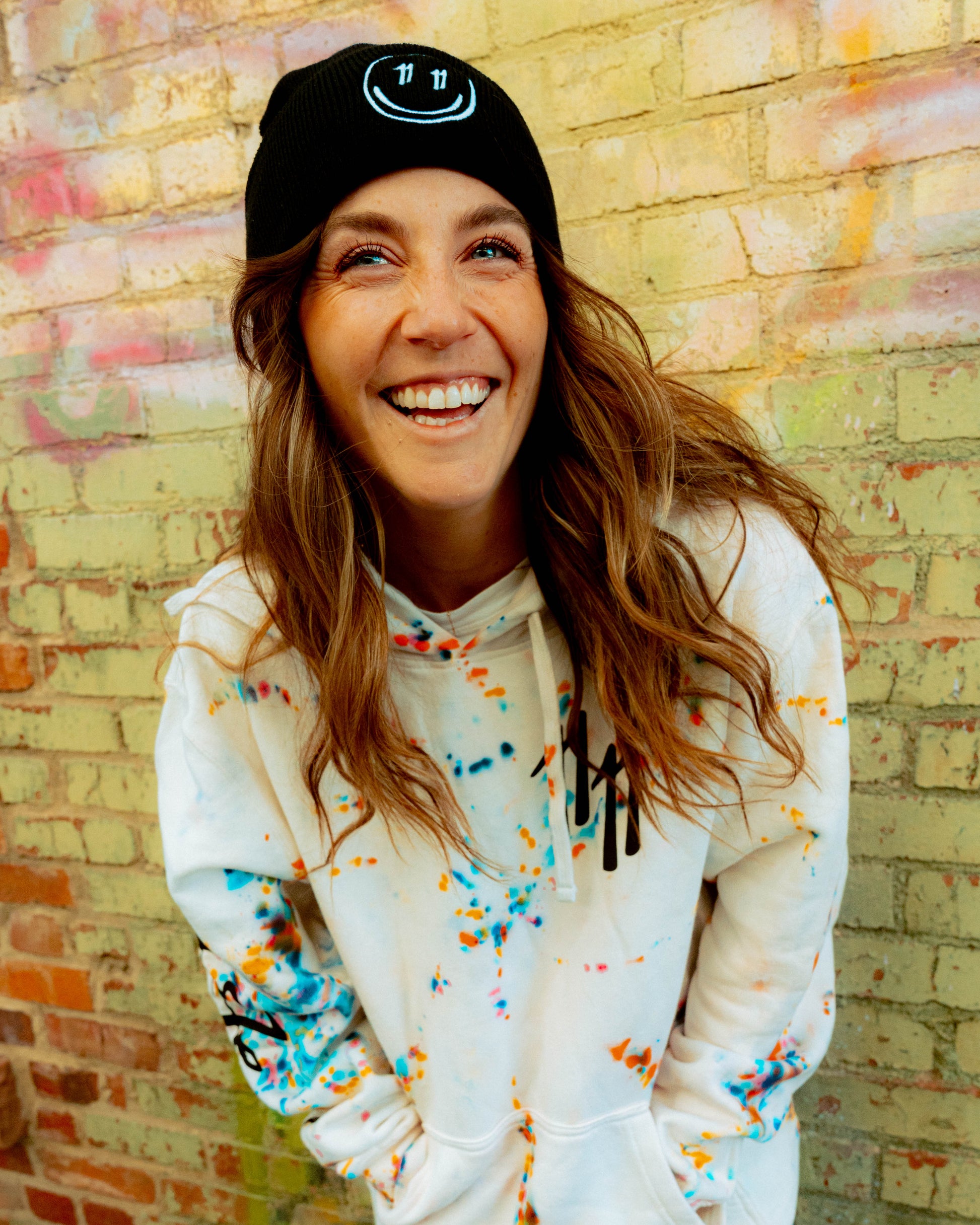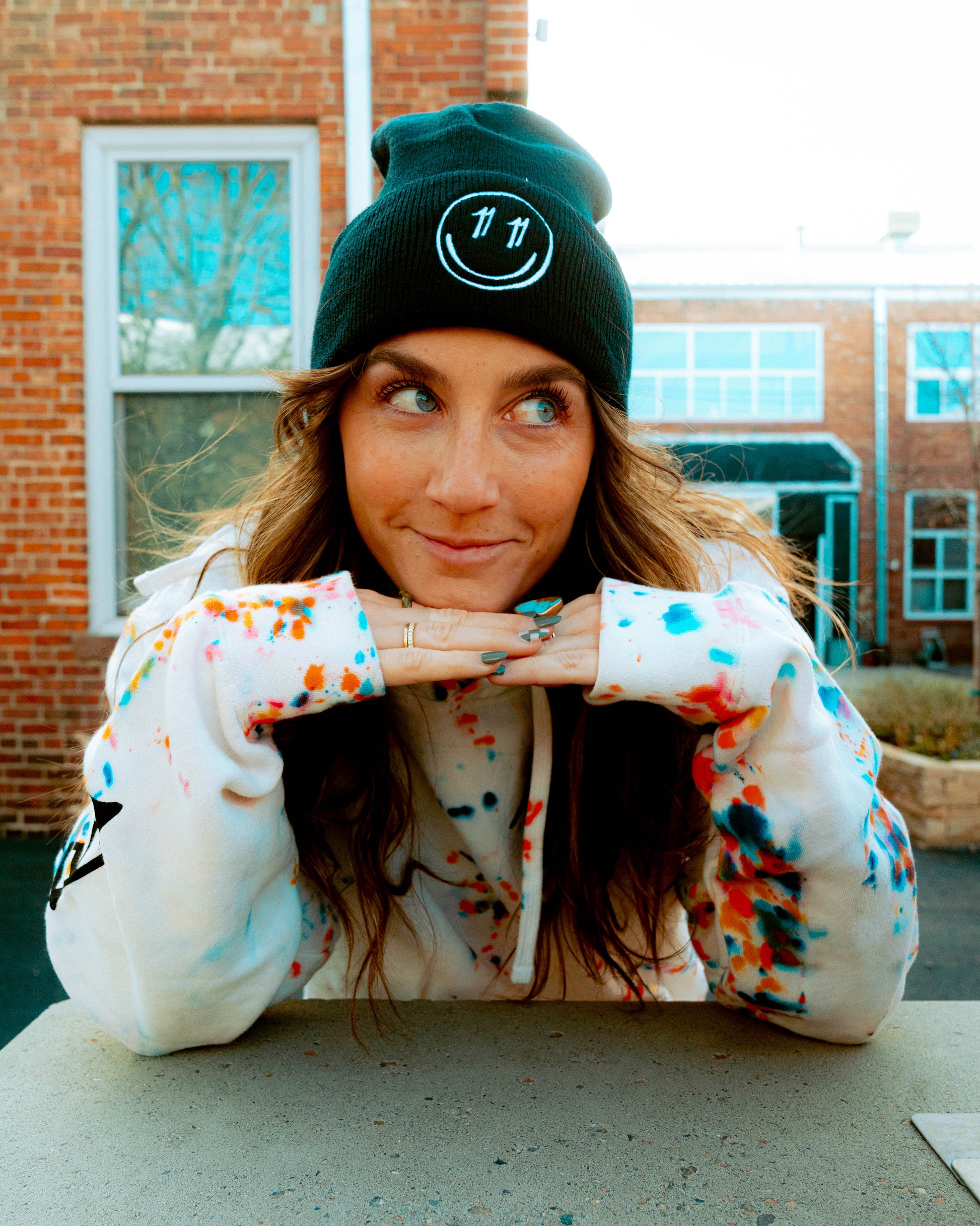 Black beanie with white 11E1even smiley embroidered on the front, one size fits most.